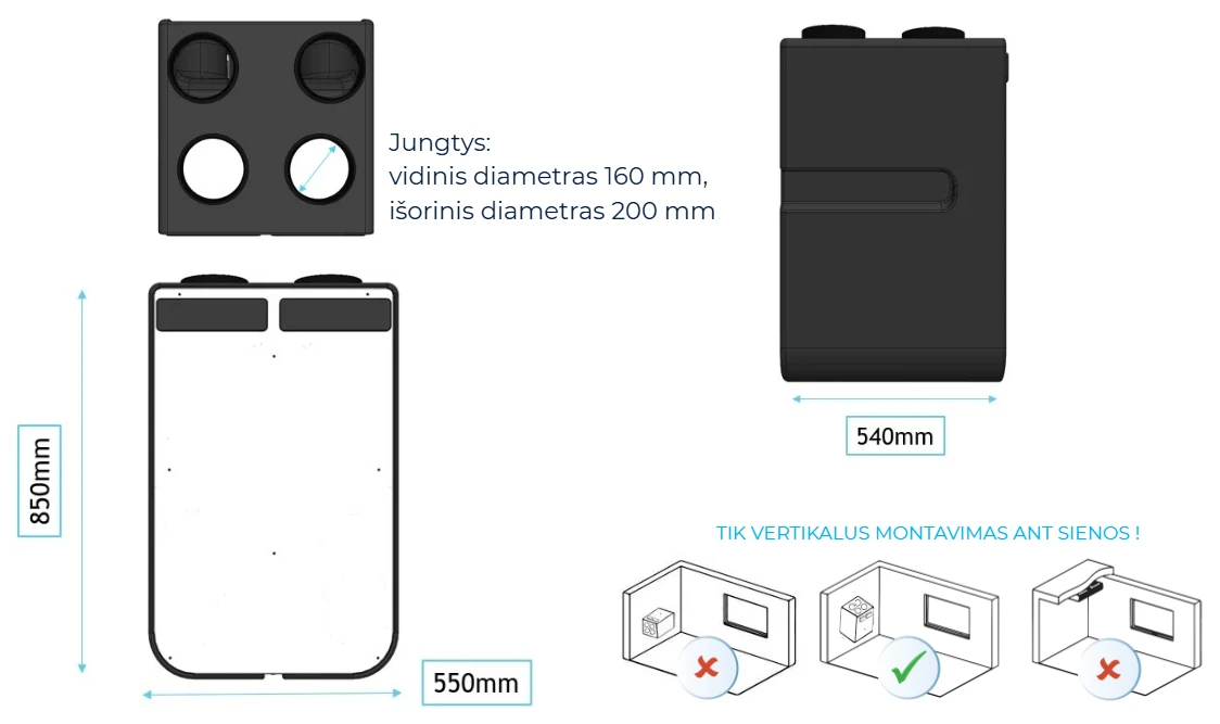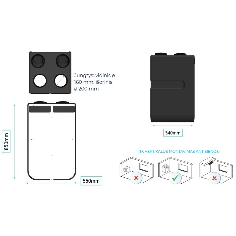 Lengvas montavimas. WI-FI valdymas . Nuolatinio srauto EC ventiliatoriai. Galimybė pajungti išorinį pašildytuvą (iki 1 kW).