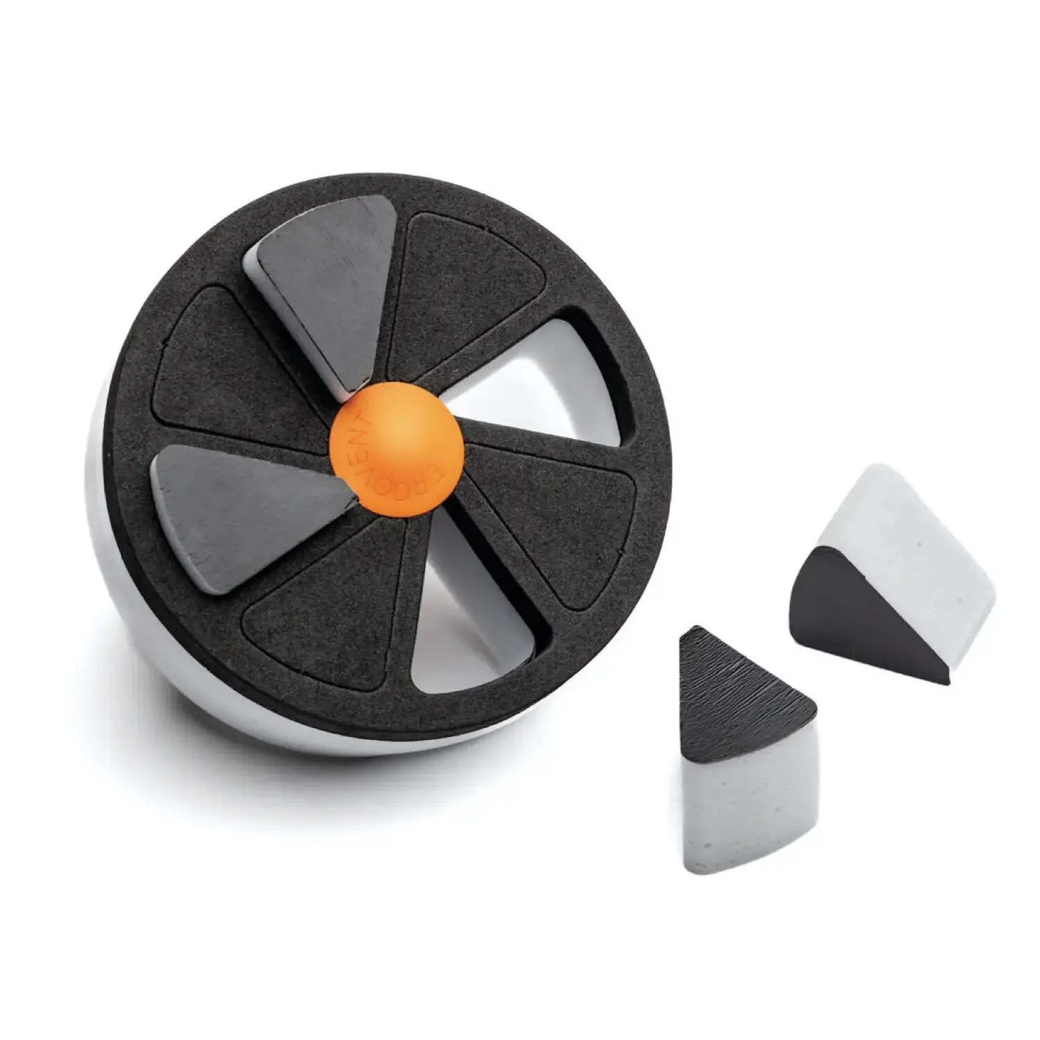 Centrinis dangtelis yra sunkus ir ne visiems gamintojams pavyko tinkamai išpręsti jo tvirtinimą. ERGOVENT difuzoriuje šį dangtelį laiko magnetiniai laikikliai, o ne varžtelių galvutės, prilimpančios prie magnetų. Magnetai pilnu paviršiumi liečiasi prie magnetizuoto nerūdijančio plieno detalės dangtelyje ir laiko tikrai patikimai. Kadangi dangtelyje nėra magnetų, tai nesusidaro ir magnetinis laukas pritraukiantis dulkes.